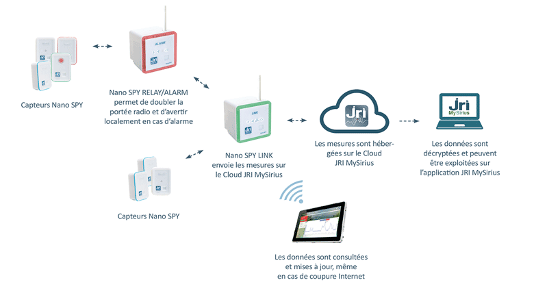 Les mesures sont ensuite envoyées vers le JRI Cloud sécurisé et exploitées via l’application de surveillance à distance de la température JRI-MySirius.
