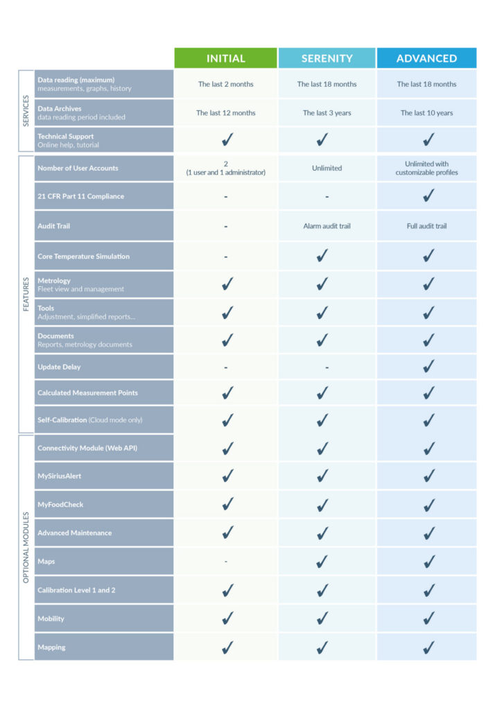 The MySirius JRI platform offers three subscription levels to suit different user needs: Initial, Serenity and Advanced. These formulas allow you to use your measurements with variable functionalities and storage durations according to your operational requirements.