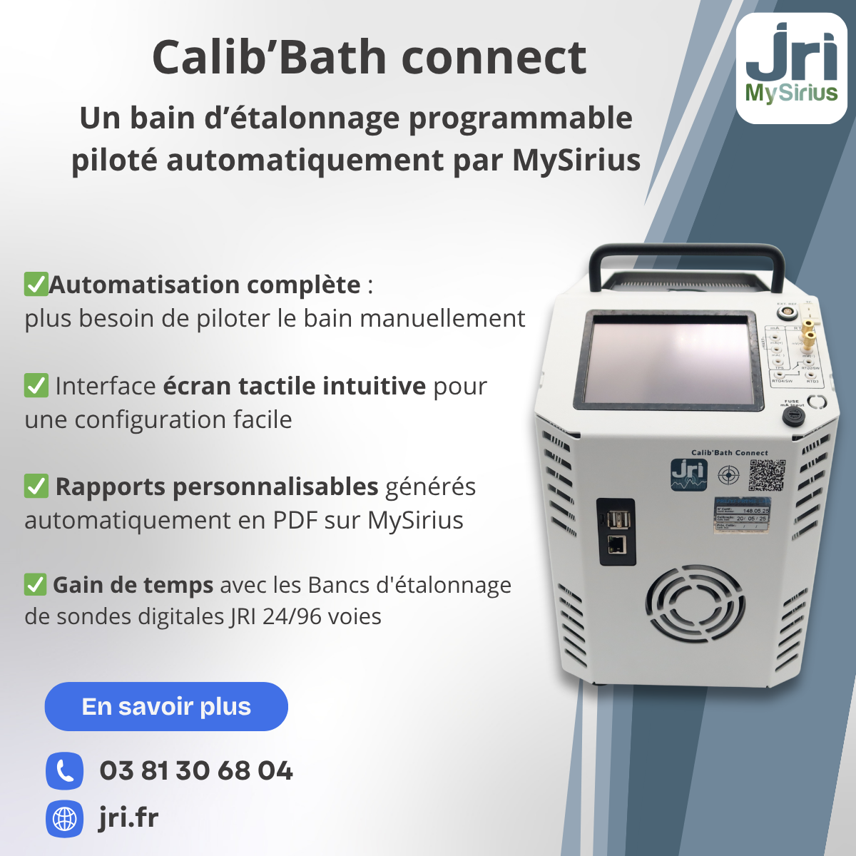JRI is taking metrological innovation a step further with the launch of Calib’Bath Connect, an automated calibration solution fully integrated with the MySirius platform. This major technological advance transforms the traditional approach to calibration by providing intelligent automation, enhanced accuracy and ease of use.