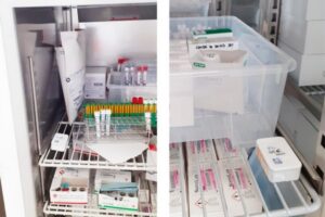 La surveillance de la température commence ainsi dès la phase de stockage dans chacun des sites périphériques où les échantillons sont conservés dans des équipements thermo-contrôlés, et se poursuit lors du transport au moyen de caissons thermostatés, jusqu’au plateau technique où elle se termine par une courte phase de conservation précédant l’analyse.