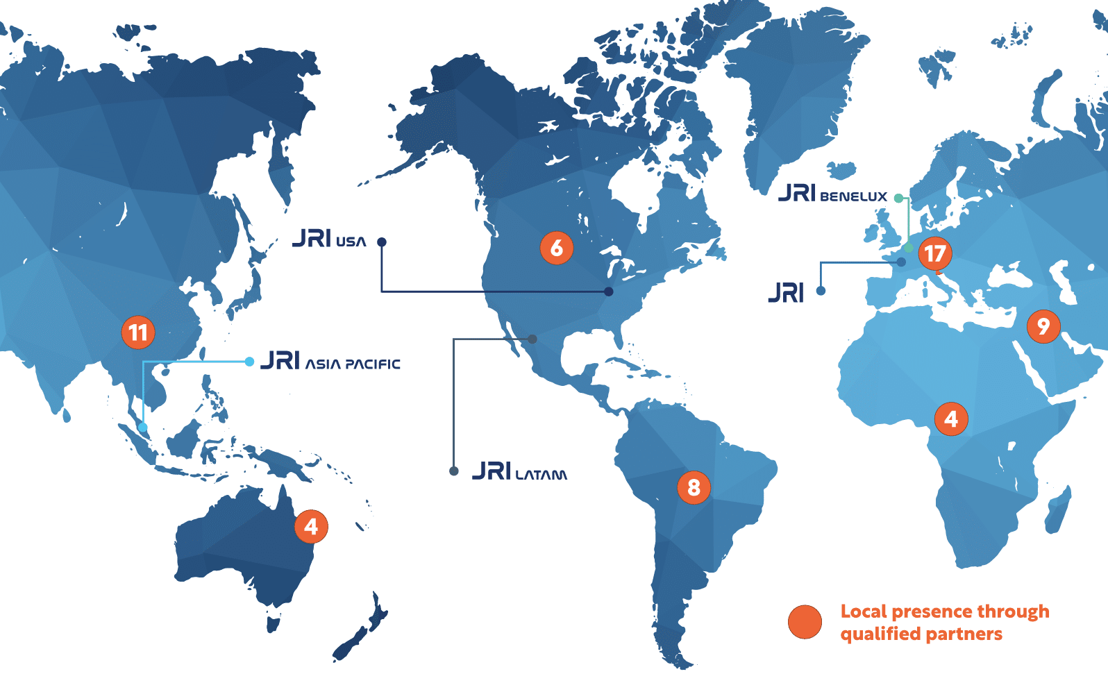 JRI has developed an effective global presence with its sales force in the field, which coordinates a vast network of qualified local partners. Strategic partnerships have been set up with carefully selected local distributors to offer you the same level of service as our teams in the field, wherever you are.